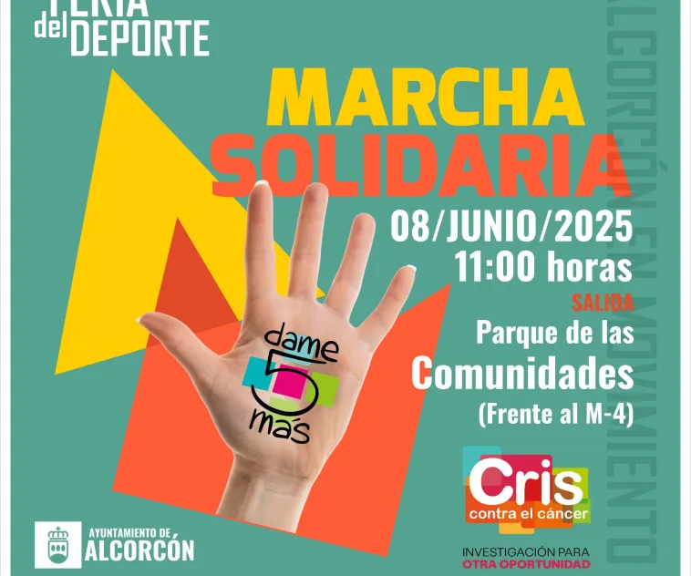 La jornada se iniciará a las 11 horas con una marcha solidaria, “Alcorcón Dame5Más” a favor de la investigación de cáncer de mama metastásico de CRIS Contra el Cáncer y cuya inscripción ya está abierta en https://criscancer.org/damecincoalcorcon/. Esta marcha recorrerá las calles de la ciudad con un circuito circular que comenzará y finalizará en el Parque de las Comunidades.