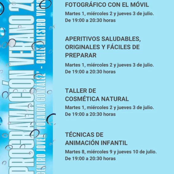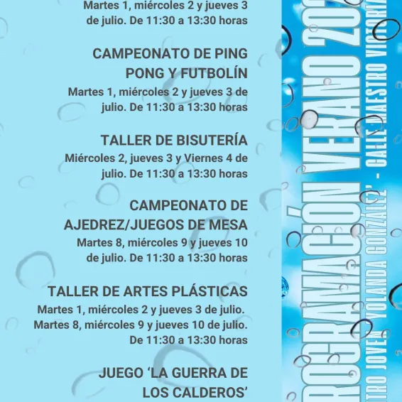De este modo, esta programación incluye actividades para distintas franjas de edad. Por un lado, existen actividades para jóvenes de 12 a 17 años como el taller ‘Crea tus mejores reels’, Bisutería o Artes Plásticas, junto otras citas deportivas como los campeonatos de ping pong, futbolín, ajedrez y juegos de mesa. Además, se realizarán actividades más lúdicas como una gymkana acuática y el juego ‘La guerra de los calderos’.