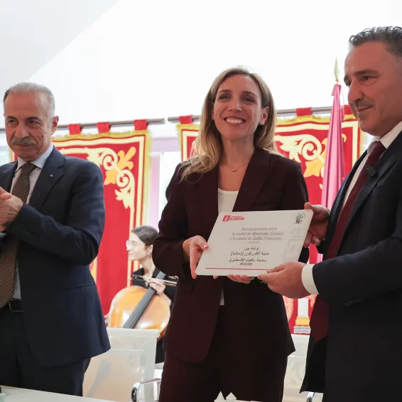 “Con este hermanamiento, estamos haciendo comunidad y estrechando lazos; hoy las manos de los alcorconeros y alcorconeras, una ciudadanía comprometida con la causa palestina desde hace décadas, se entrelazan con las de los vecinos y vecinas de Salfit; hoy reafirmamos los valores que caracterizan a esta ciudad: la paz, la justicia y, por supuesto, la libertad”, ha señalado la alcaldesa de Alcorcón, Candelaria Testa, durante la firma del hermanamiento con el alcalde de Salfit (Cisjordania) y también presidente de la Asociación de Autoridades Locales Palestinas (APLA), Abdul Karim Zbeidie.