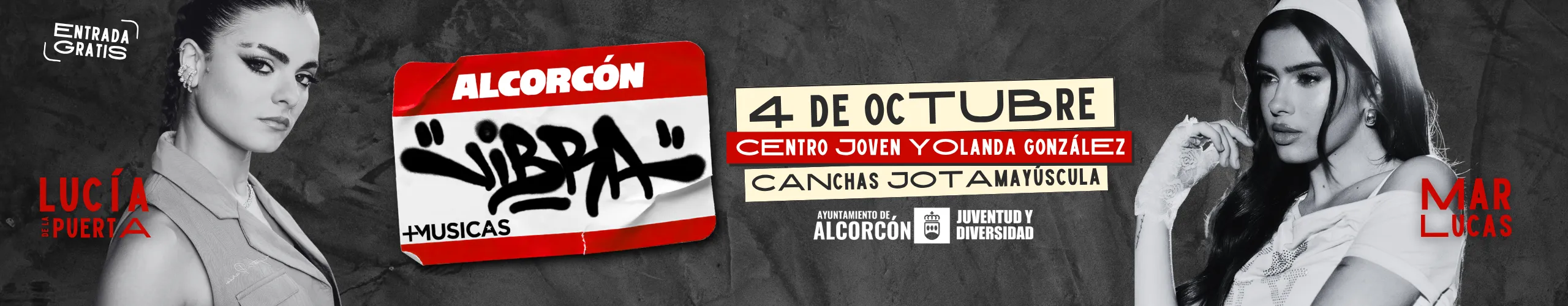 • Mar Lucas y Lucía de la Puerta encabezan este año el cartel de una programación en la que la música, deporte y diversas actividades son las claves de una completa programación que tendrá lugar el sábado 4 de octubre a partir de las 17 horas en las canchas ‘Jota Mayúscula’ frente en el Centro Joven Yolanda González. ‘Alcorcón Vibra’. Este encuentro cuenta con la participación de distintas entidades, asociaciones y colectivos juveniles del municipio.