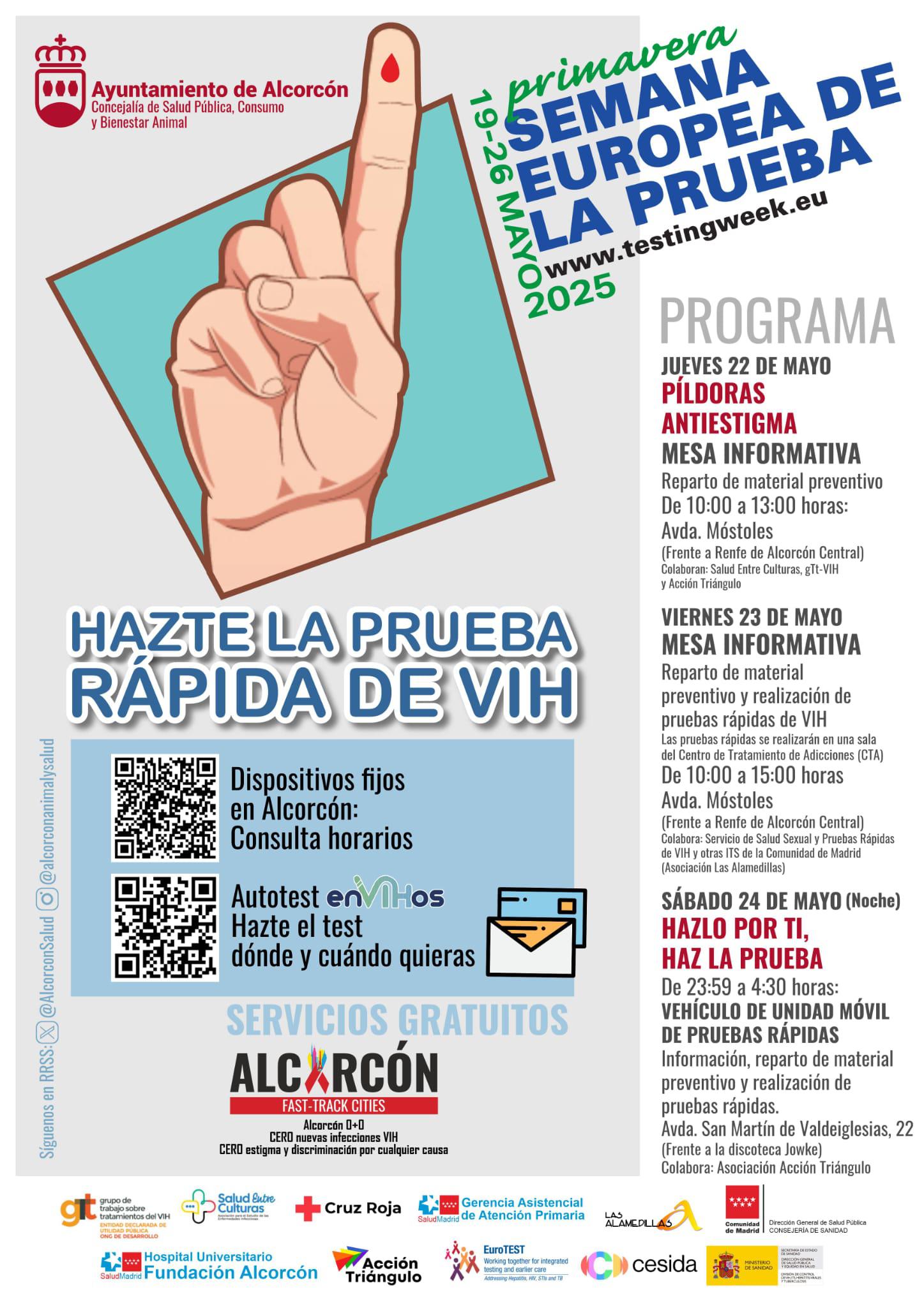 El Ayuntamiento de Alcorcón, a través de la concejalía de Salud Pública, Consumo y Bienestar Animal, continúa reafirmando su compromiso en la lucha contra el VIH. Así, del 19 al 26 de mayo, la ciudad celebra la Semana Europea de la Prueba. La ciudad contará con mesas informativas y pruebas rápidas el 22 y 23 de mayo a partir de las 10 horas frente a la Renfe de Alcorcón Central. El sábado 24 habrá una Unidad Móvil de madrugada frente a la discoteca Jowke. Esta campaña promovida por EuroTEST impulsa la realización de pruebas de diagnóstico para el VIH, hepatitis y otras ITS.