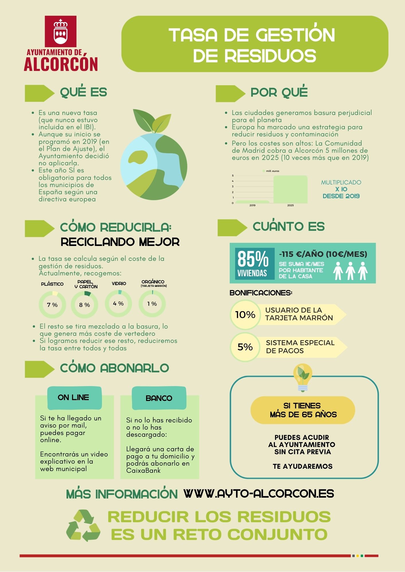 En Alcorcón, la Tasa de Gestión de Residuos, se ha calculado con criterios de progresividad, aplicando reducciones para los titulares beneficiarios de fondos de emergencia social y para las viviendas con más de 5 personas empadronadas.