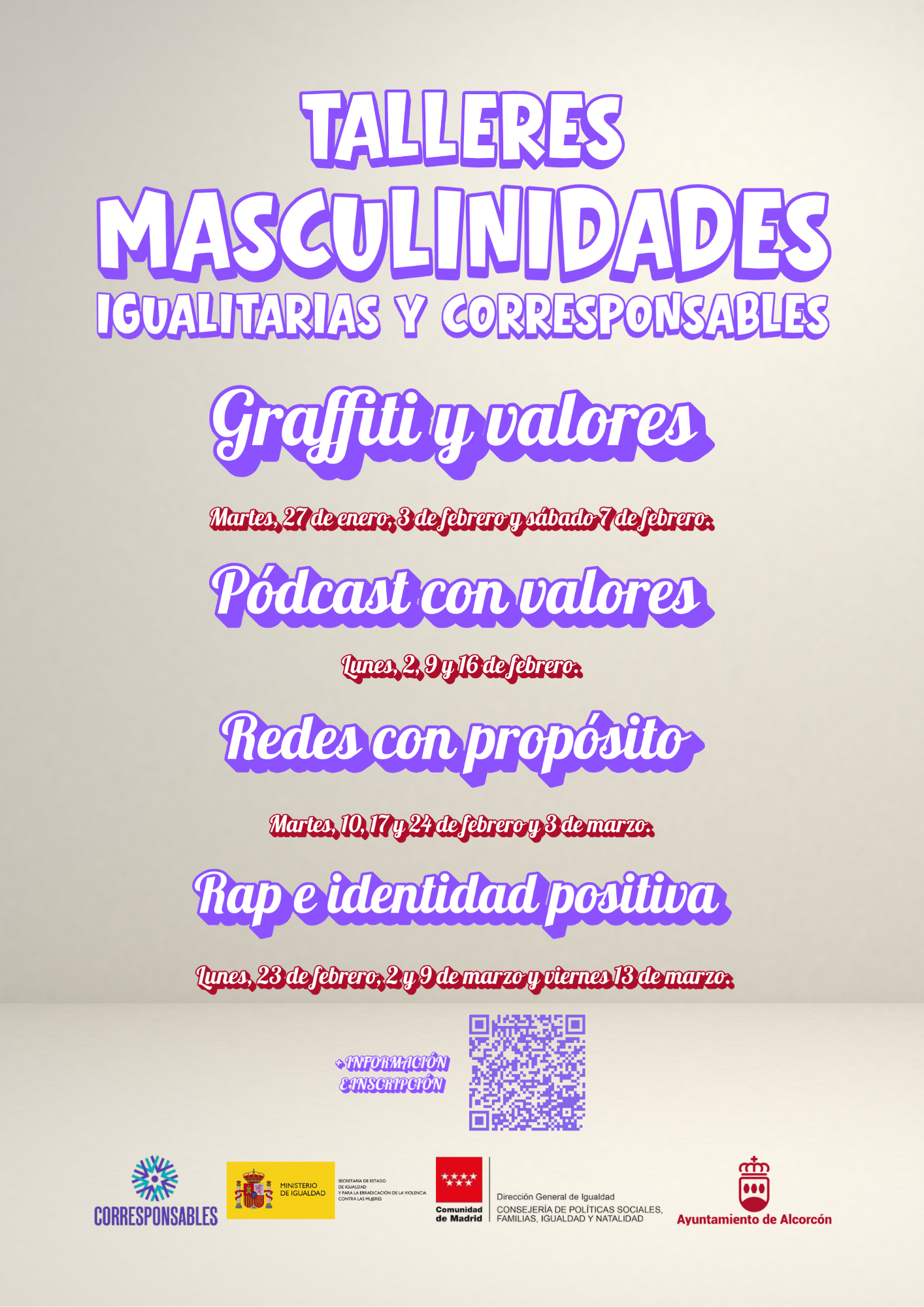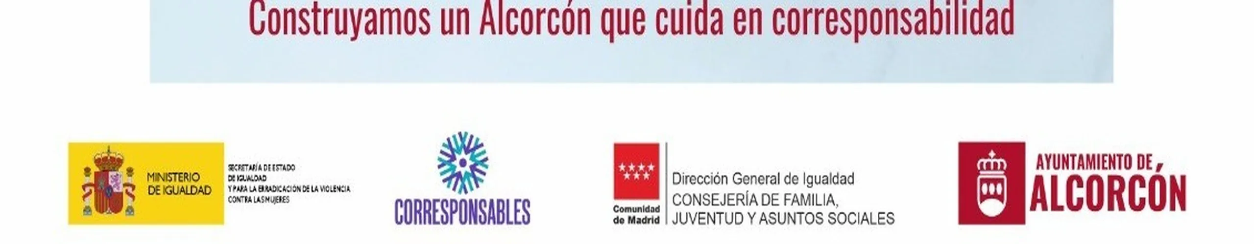 Dentro del PLAN CORRESPONSABLES se está llevando a cabo proyecto de “SENSIBILIZACIÓN Y FORMACIÓN ALCORCON CORRESPONSABLES cuyo objetivo general es el sensibilizar y formar al conjunto de la sociedad y particularmente a los hombres en materia de corresponsabilidad en las tareas de cuidados con el fin de impulsar modelos de masculinidades corresponsables e igualitarias, proyecto financiado con cargo a los fondos recibidos del Ministerio de Igualdad, Secretaría de Estado de Igualdad para la Erradicación de la Violencia contra las Mujeres, en el marco del Plan Corresponsables.