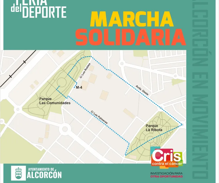 • La jornada se iniciará a las 11 horas con una marcha solidaria, “Alcorcón Dame5Más” a favor de la investigación de cáncer de mama metastásico de CRIS Contra el Cáncer y cuya inscripción ya está abierta en https://criscancer.org/damecincoalcorcon/. Esta marcha recorrerá las calles de la ciudad con un circuito circular que comenzará y finalizará en el Parque de las Comunidades.