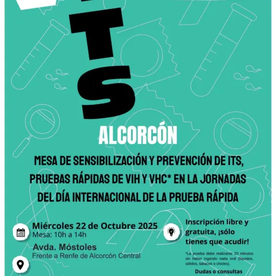 Entre las actividades destacadas, se instalará una Mesa de sensibilización y prevención de ITS. Esta mesa estará operativa el miércoles 22 de octubre, de 10 a 14 horas, en la Avenida de Móstoles, frente a la estación de Renfe de Alcorcón Central, y contará con la colaboración de APLEC Inclusión Más Igualdad. Se realizarán pruebas rápidas de VIH y VHC de manera anónima, confidencial y gratuita en el Centro de Tratamiento de Adicciones de Alcorcón (CTA).