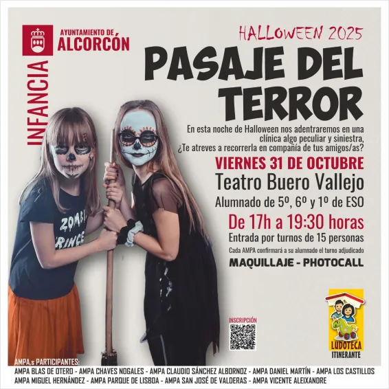 Los y las más pequeñas cuentan también con su particular ‘Pasaje del Terror’ que impulsa Infancia a través del programa Ludoteca Itinerante. Esta actividad, destinada al alumnado de 5º, 6º de Primaria y 1º de ESO, se desarrollará de 17 a 19.30 horas por turnos cada 15 personas y contará con maquillaje y photocall. Esta actividad, que requiere inscripción previa en el enlace Pasaje del Terror, se desarrolla con la participación de diversas AMPA de la ciudad.