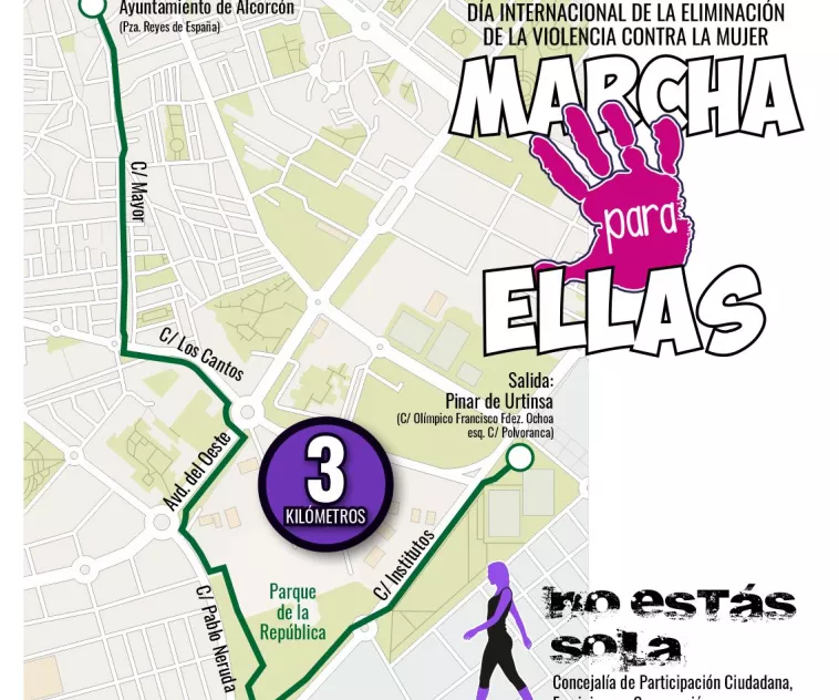 La marcha popular urbana ‘Marcha para ellas’ partirá este 25 de noviembre de la confluencia de las calles Olímpico Fernández Ochoa y Polvoranca (frente a los campos de fútbol Vicente del Bosque y el pinar), con un recorrido de 3 kilómetros que finalizará en el Ayuntamiento donde se leerá un manifiesto.