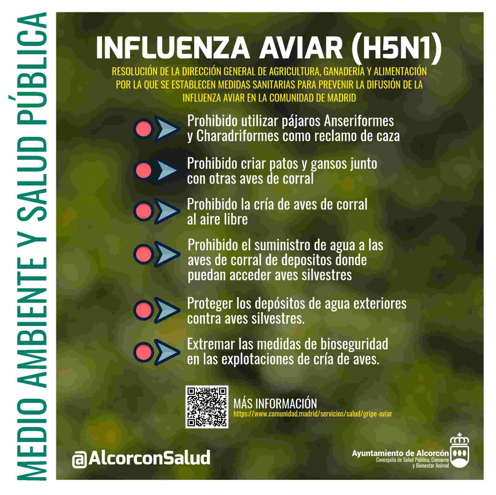 La Comunidad de Madrid ha activado medidas sanitarias de prevención frente a la influenza aviar (H5N1) con el objetivo de proteger la salud animal y evitar la propagación del virus.